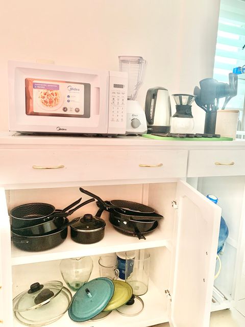 There is a kitchen with lots of cooking appliances, stove, three coffee makers (pour over coffee, Italian coffee maker, drop coffee maker, there is a kettle, knives, pots, pans and everything you could need in a kitchen.